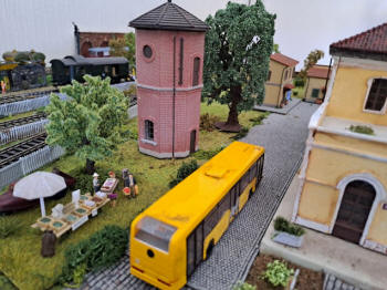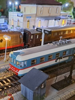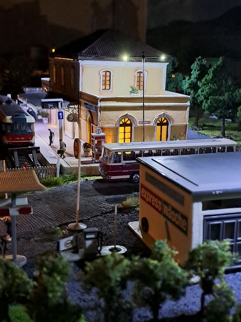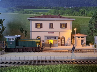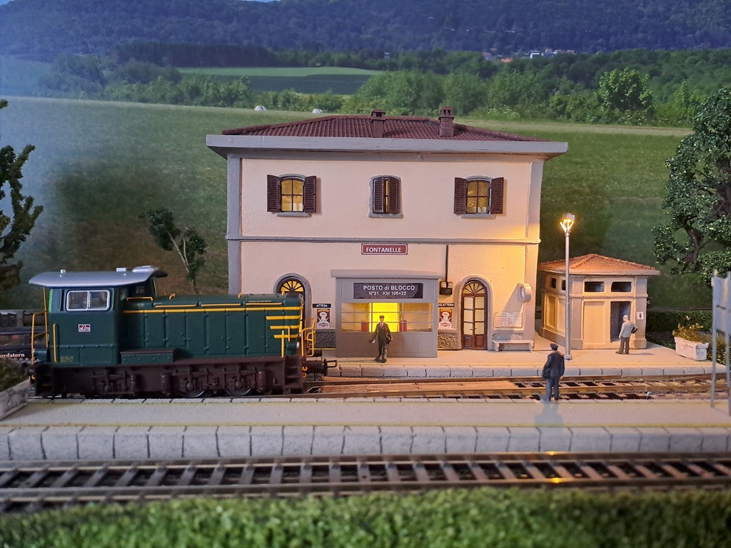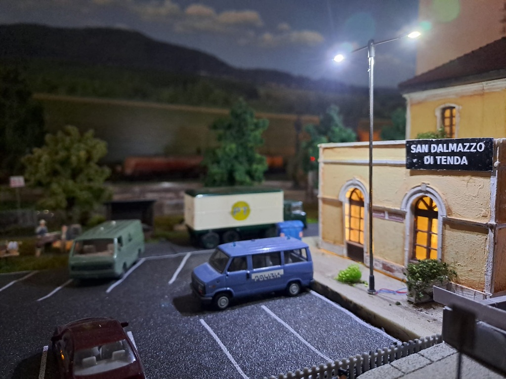 Entriamo ora nel dettaglio: la stazione principale è inserita in un contesto urbanistico, a mio avviso, più reale. E' una stazione ubicata nell'ipotetica periferia di San Dalmazzo di Tenda (raggiungibile attraverso un passaggio a livello) quindi piuttosto isolata con un viale alberato che la costeggia, il suo deposito locomotive, un parcheggio con un piccolo mercato, un'edicola, una stazione di servizio e una casa cantoniera ANAS. Nelle vicinanze della stazione troviamo una collina con la chiesetta di San Nazario e un ripetitore radio/tv. Sempre sulla linea principale, troviamo la stazione di Fontanelle con il suo piccolo borgo (stazione anch'essa in stile FS), un casello di linea FS e una piccola area industriale. Infine una diramazione conduce allo scalo merci di Borghetto con il deposito carburante che rifornisce sia le locomotive diesel sia l'area di servizio di San Dalmazzo. Per quanto riguarda il mio "deposito" troviamo: una FS D341, una FS D143, una FS ALn 668, una FS 245 e una DB BR 290.